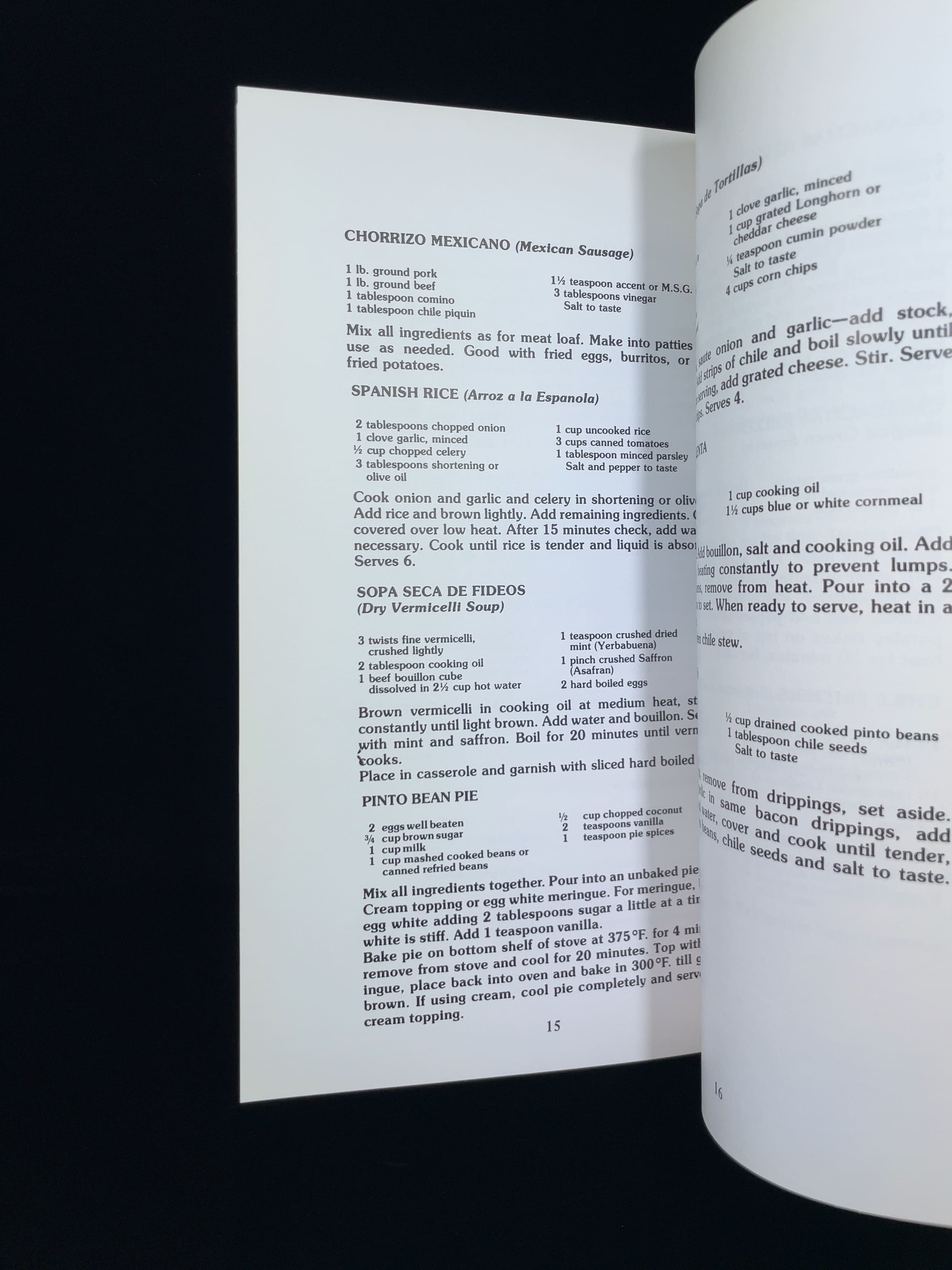 スパニッシュ・ライス、ソパ・セカ・デ・フィデオス(乾麺のスープ)、ピントビーンズ・パイなど多数掲載。